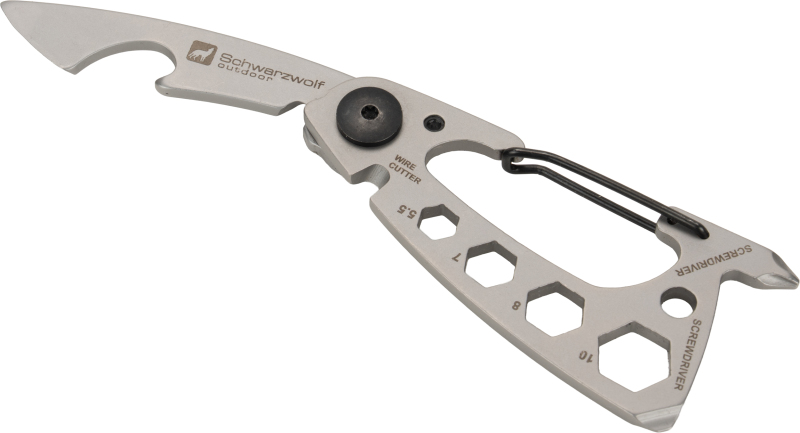 Multifunctional Schwarzwolf tool with 10 functions. It has a carabiner, bottle opener, multifunctional opener, wire cutter, slot head screwdriver, Phillips head screwdriver and spanner (4 sizes). Packed in a Schwarzwolf gift box.
