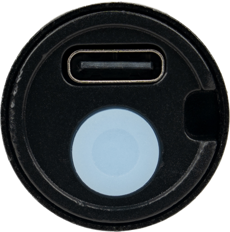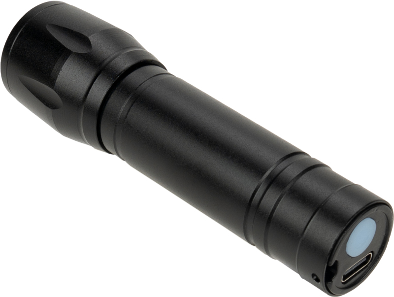 Rechargeable aluminum flashlight (400 mAh) in a black box, including a USB-C charging cable. The flashlight features a COB light with an adjustable beam and a COB light on the shaft. Your logo will be printed in the center of the box lid.