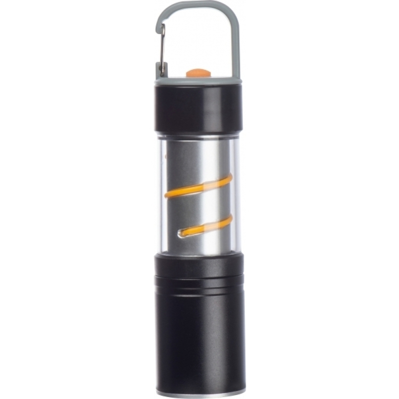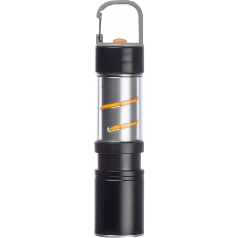 Rechargeable COB flashlight with clip and 500mAh capacity. Includes Type-C cable. The flashlight with blinking function also features an adjustable light beam and a light spiral on the shaft.