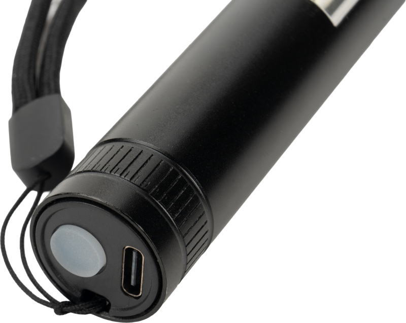 Multifunctional, rechargeable COB flashlight made of aluminum. The flashlight features a 500 mAh battery, a USB-C charging cable, a safety hammer, a seatbelt cutter, a wrist strap, and a magnet for easy attachment.