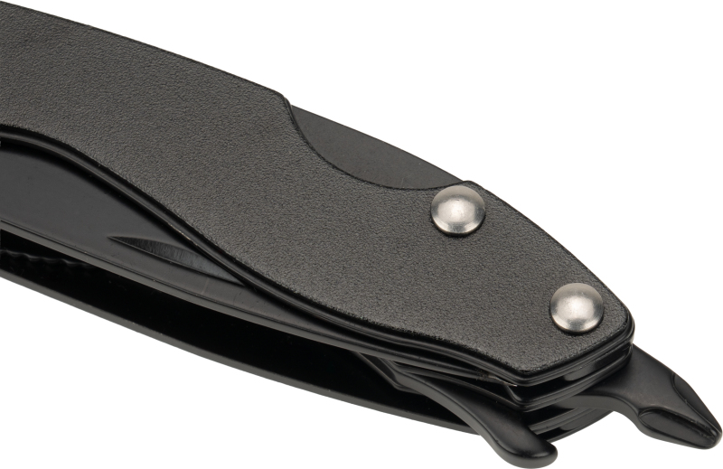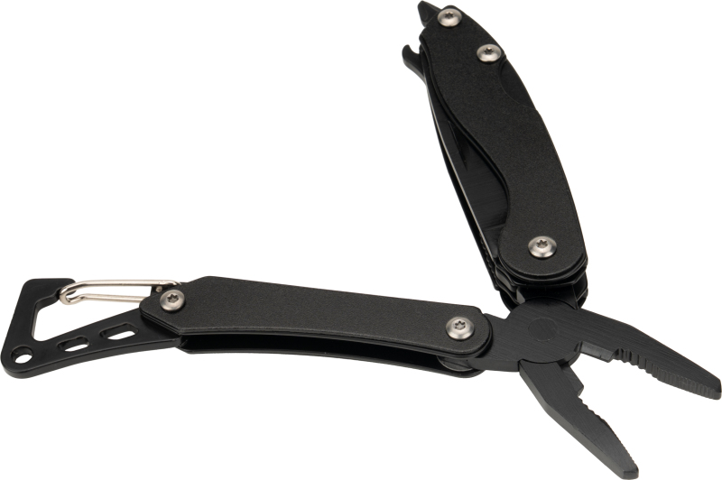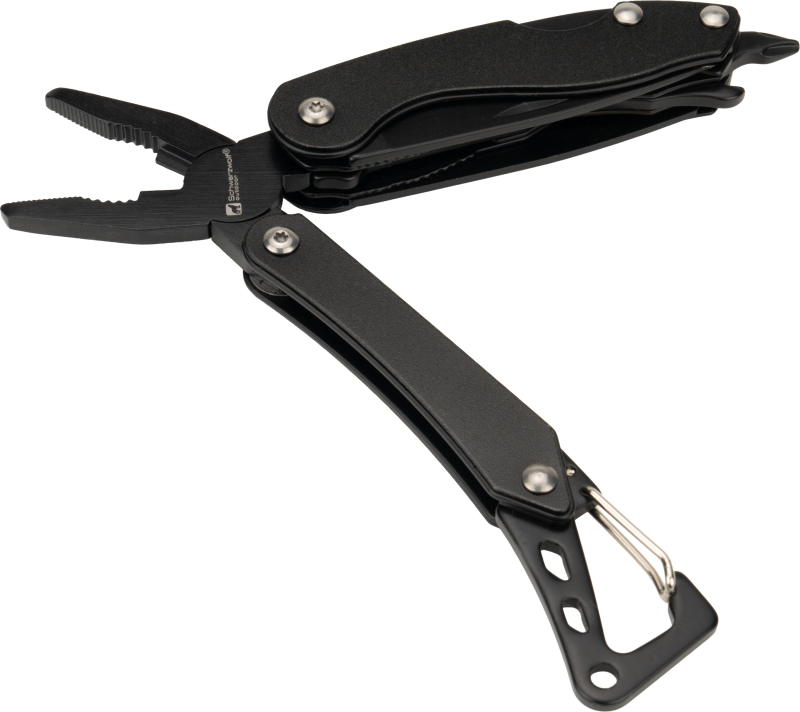 Multifunctional Schwarzwolf tool with 6 functions. It includes knife, saw, pliers, carabiner, bottle opener and Phillips screwdriver.