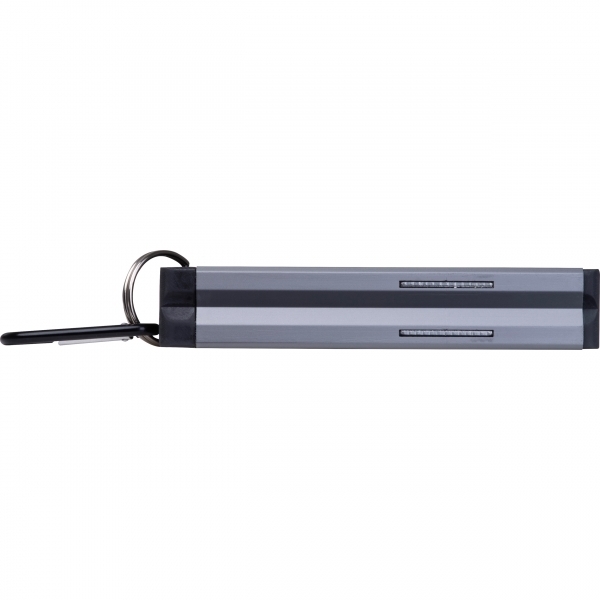 Mini spirit level made of aluminum with ABS plastic applications, two vials, a magnet on the bottom, and a carabiner. Your logo is applied to the spirit level using laser engraving.