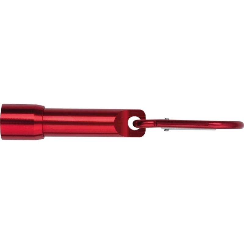 Mini flashlight with carabiner hook made from recycled aluminum. Includes 4 button cell batteries. Your logo is applied to the flashlight using laser engraving.
