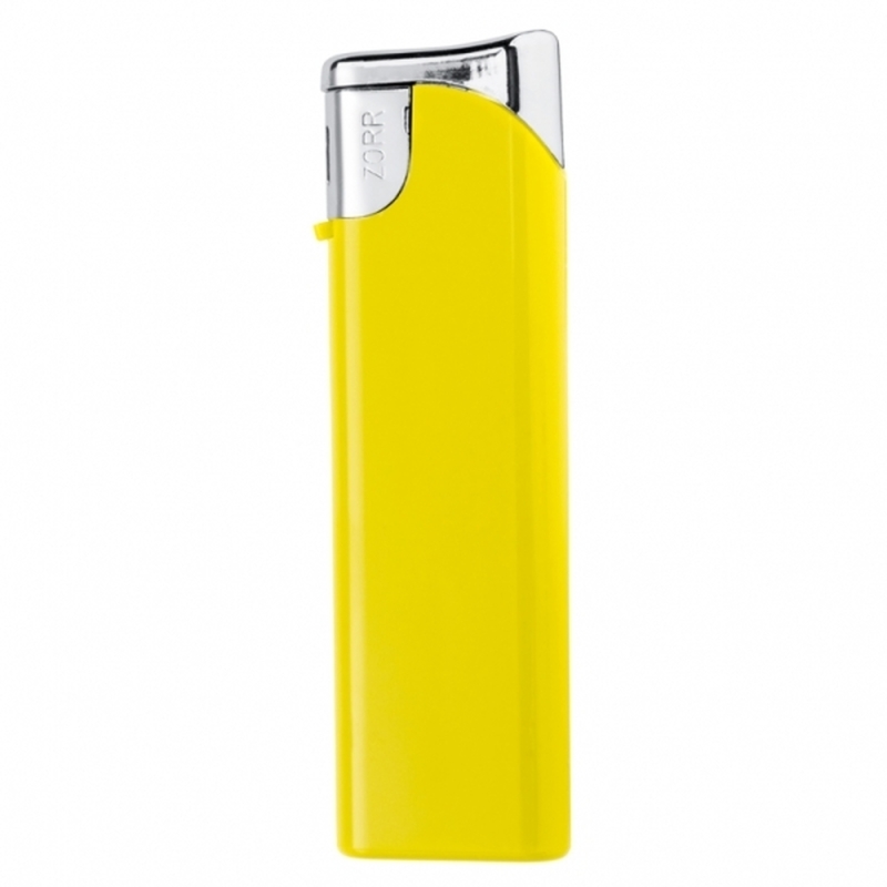 Refillable electronic lighter made of plastic. Of course, this model has the mandatory child safety lock. We print your logo on one side of the lighter.