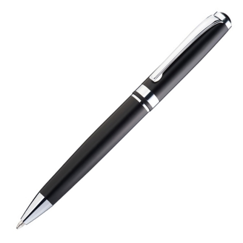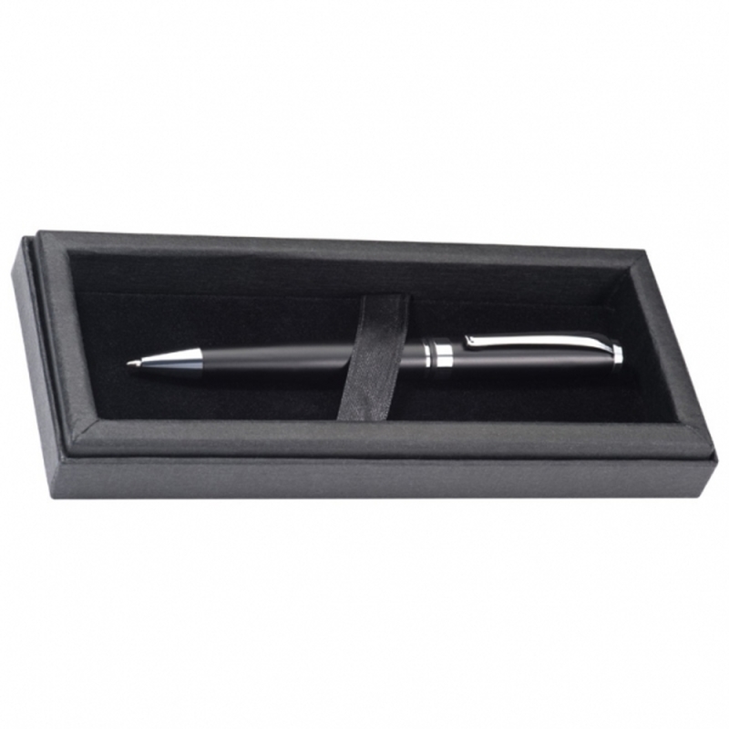 High-quality metal pen in matt black, with shiny silver applications, and elegant case. We will engrave your logo below the clip.