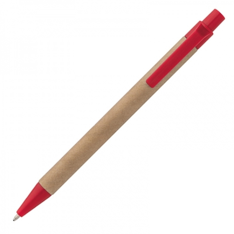 Ballpoint pen made of recycled paper and colored plastic applications, blue writing. Your logo is printed to the right of the clip.
