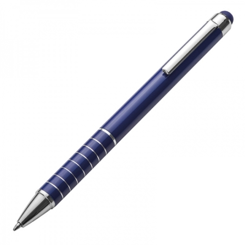 Twist ball metal pen with touch function and blue writing refill. 8 engraved rings make the writing convenient. Your logo will be laser engraved below the clip.
