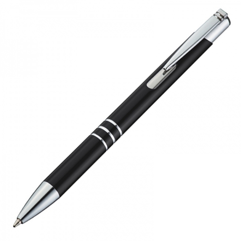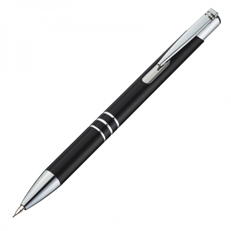 Writing set made of aluminum, consisting of a ballpoint pen with blue writing large capacity refill and a mechanical pencil, each with decorative rings. Your logo will be engraved to the right of the clip.