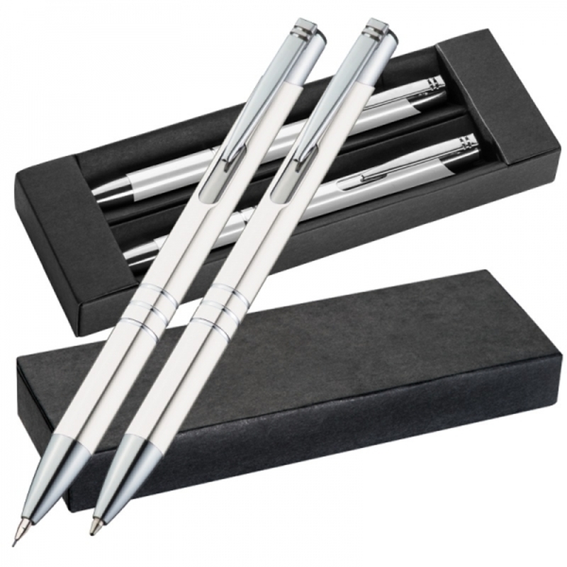 Writing set made of aluminum, consisting of a ballpoint pen with blue writing large capacity refill and a mechanical pencil, each with decorative rings. Your logo will be engraved to the right of the clip.