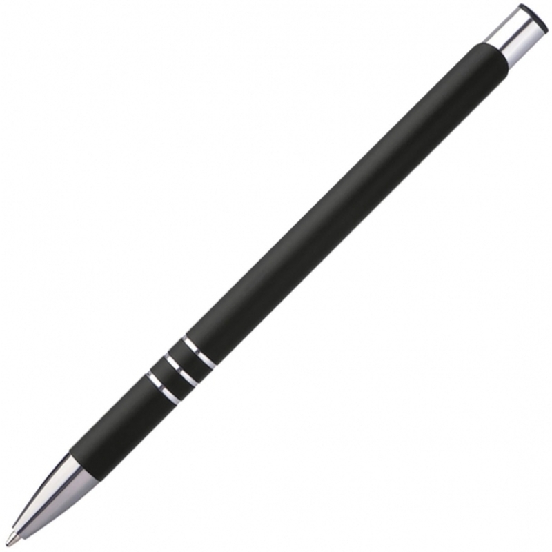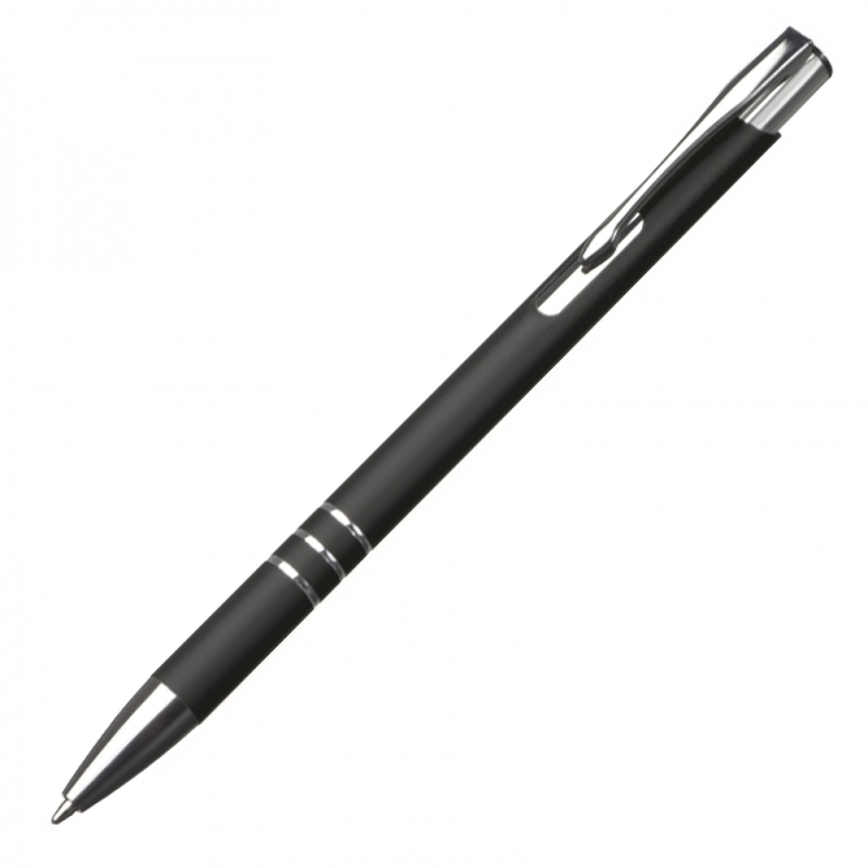 Slim metal ballpen with rubber finish and blue writing plastic refill. Your logo will be engraved below the clip.