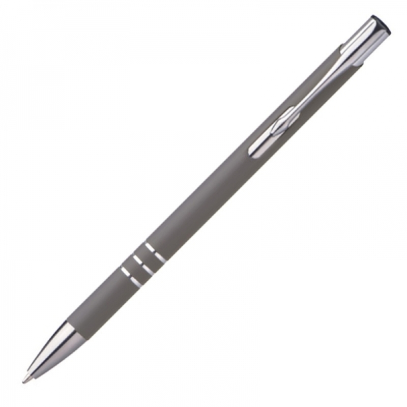 Slim metal ballpen with rubber finish and blue writing plastic refill. Your logo will be engraved below the clip.