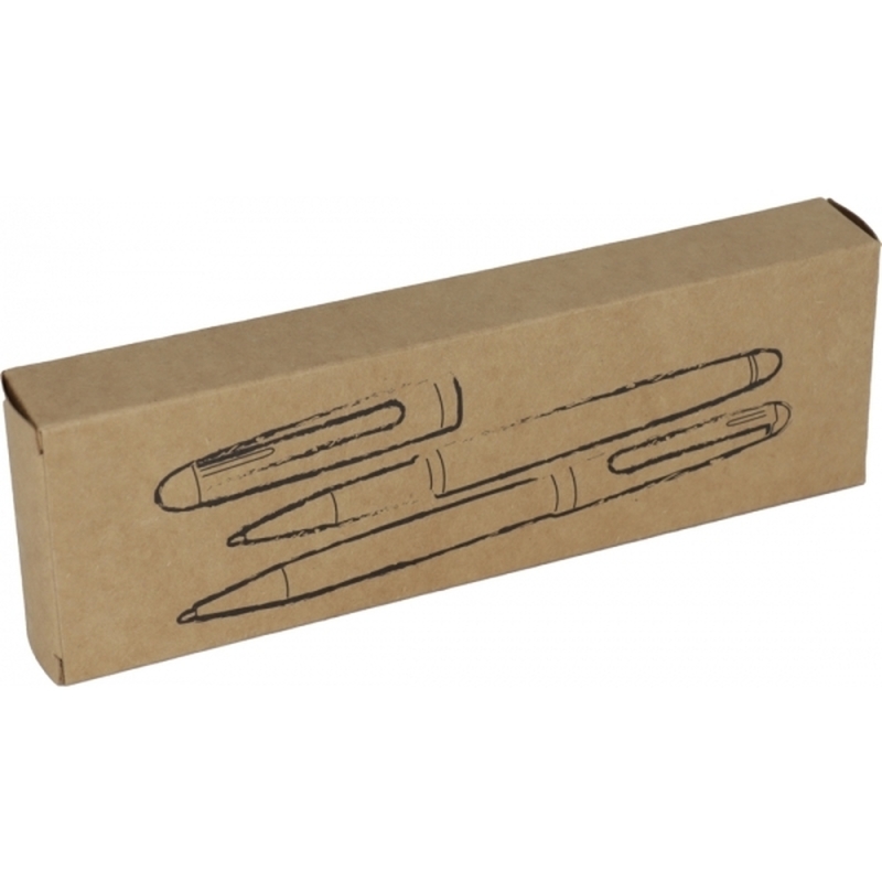 Wooden writing set consisting of a blue-writing ballpoint pen and a b-writing rollerball in a case. We engrave your logo on the case.