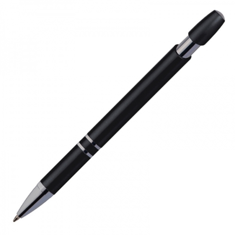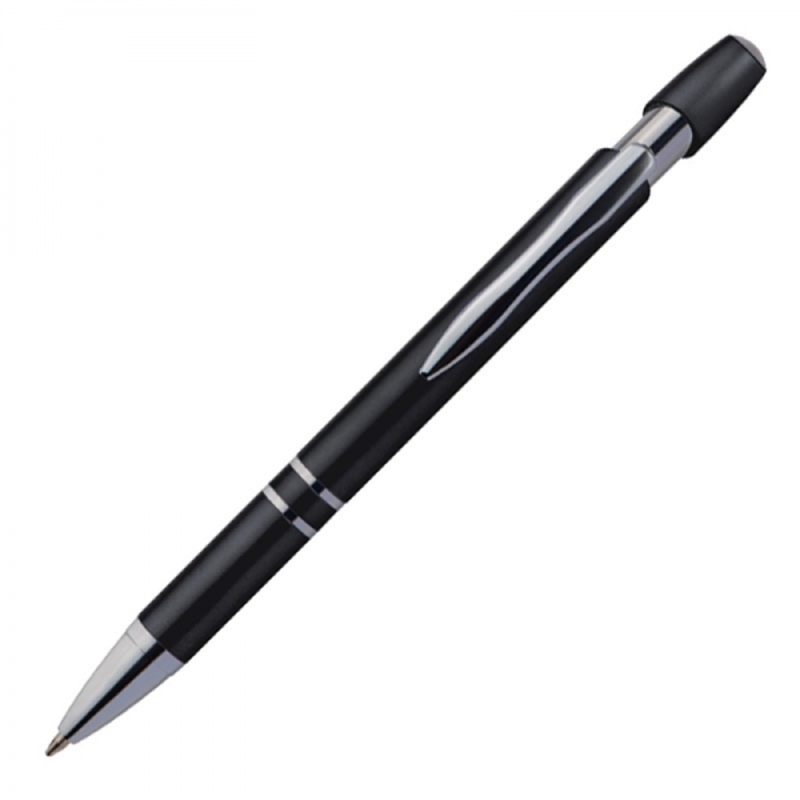 Metallic-looking plastic ballpen with large capacity refill and push function. We will print your logo below the clip.
