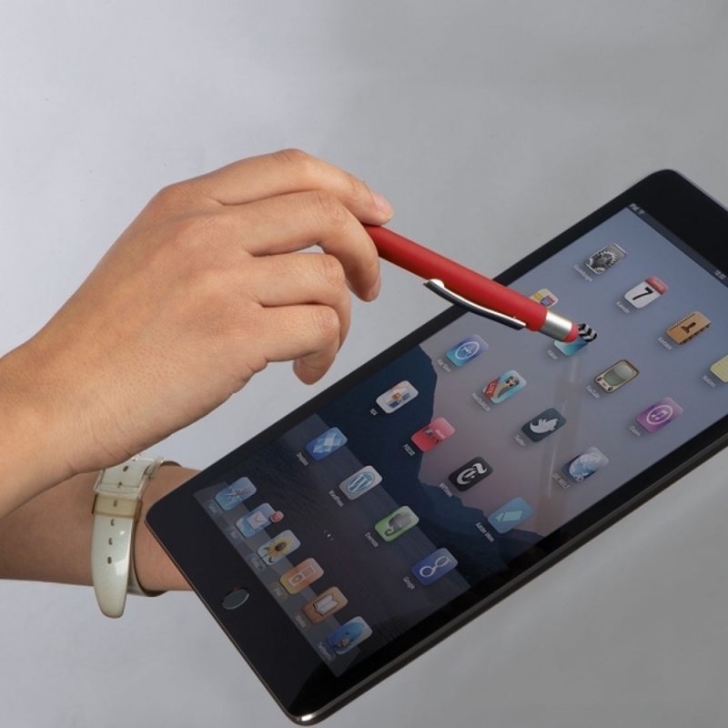 Metal ball pen with rubber finish surface, touch pen and blue writing large capacity refill. We laser your logo on the right side of the clip.