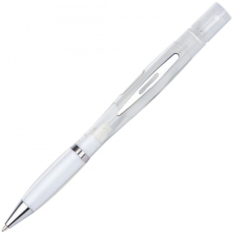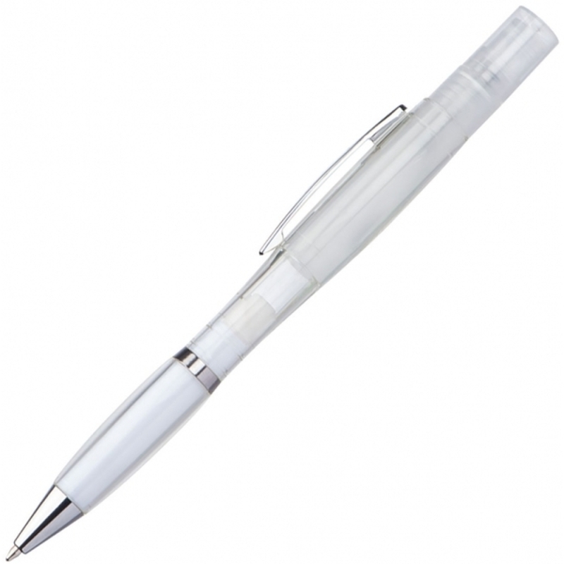 Translucent Twistpen with silver applications and blue-writing refill. The sprayer is refillable - perfect for perfume or desinfection fluids.We print your logo on the right side of the clip.