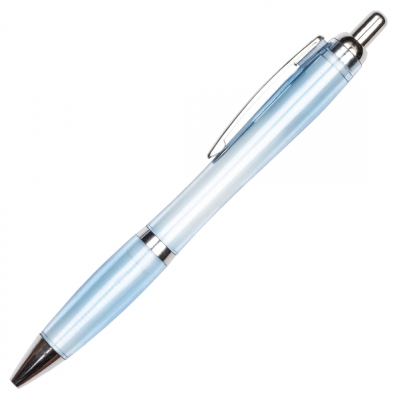 Classic ball pen made of recycled PET, transparent with silver applications and blue writing large capacity refill. Your logo will be printed to the right of the clip.