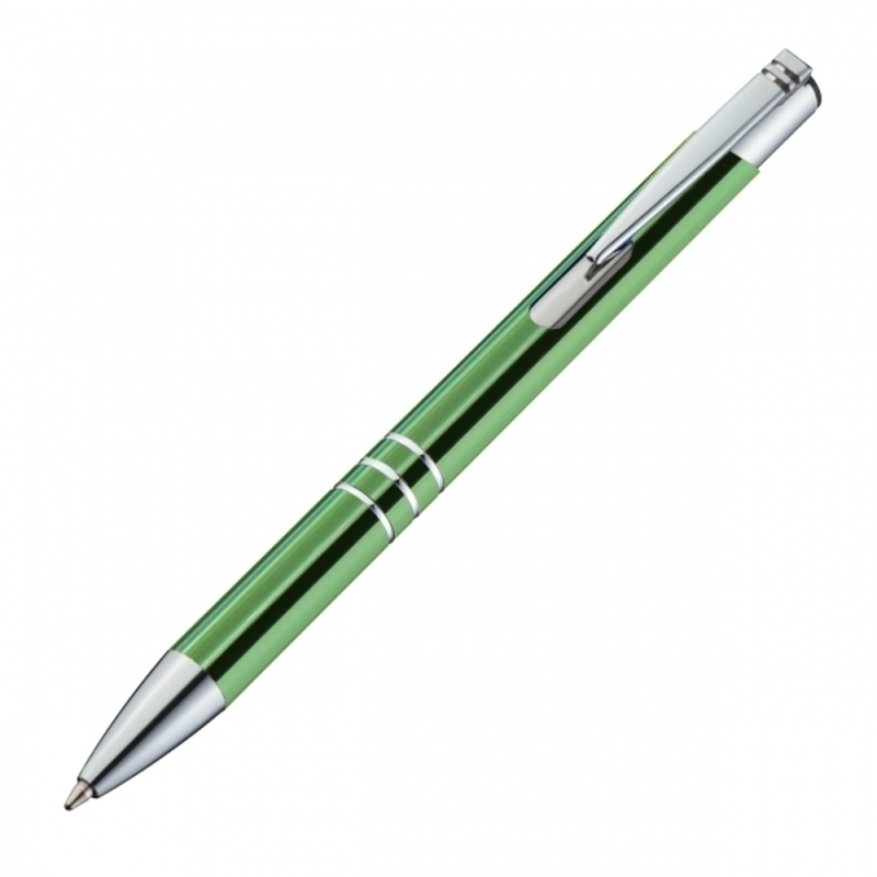Metal pen with blue-writing refill. We will engrave your logo below the clip.