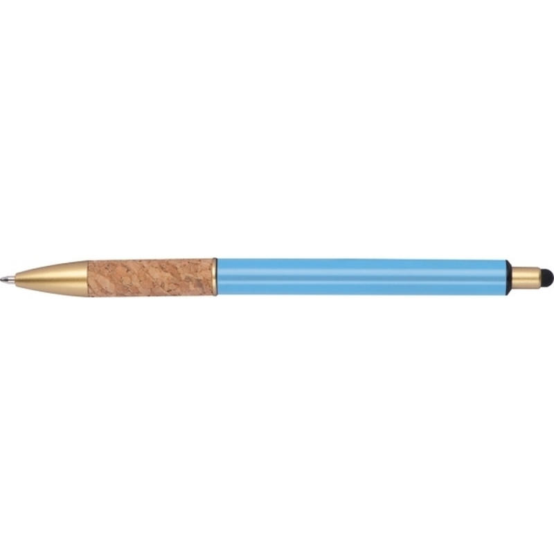 Metal ball pen with golden applications, blue-writing refill and cork grip zone. Your logo will be engraved to the right of the clip.