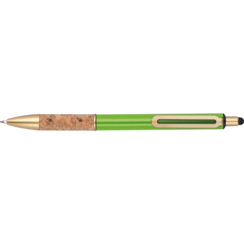 Metal ball pen with golden applications, blue-writing refill and cork grip zone. Your logo will be engraved to the right of the clip.