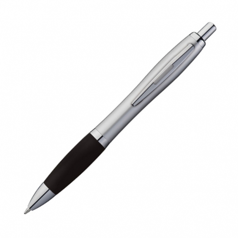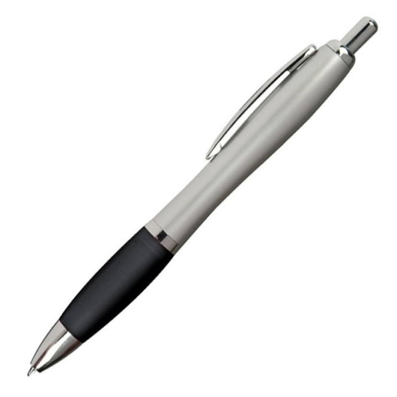 Ballpoint pen with blue writing large capacity refill and color contrast soft touch grip zone. We print your logo on the right side of the clip.