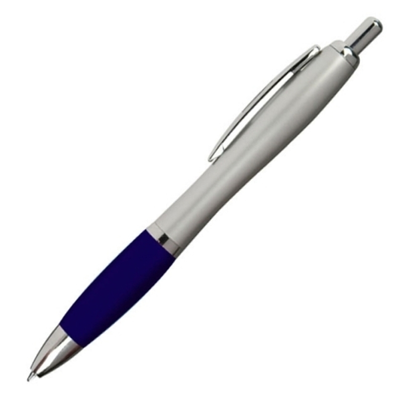 Ballpoint pen with blue writing large capacity refill and color contrast soft touch grip zone. We print your logo on the right side of the clip.