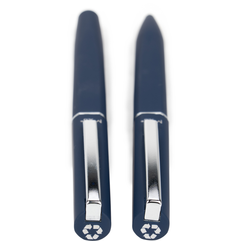 A writing set consisting of a ballpoint pen and a rollerball pen, made of recycled stainless steel. Both writing instruments have a rubber coating and gun-metal accents.