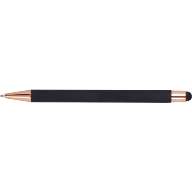 Ballpoint pen made of aluminum with a rubber finish surface, rose gold accents, and a touch pen. It is equipped with a blue-writing large-capacity plastic refill. Color of engravering: silver