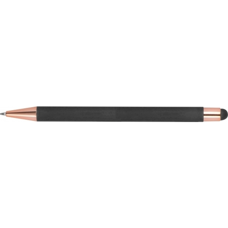 Ballpoint pen made of aluminum with a rubber finish surface, rose gold accents, and a touch pen. It is equipped with a blue-writing large-capacity plastic refill. Color of engravering: silver