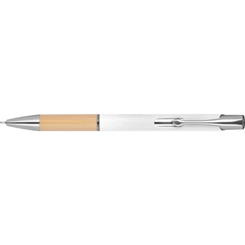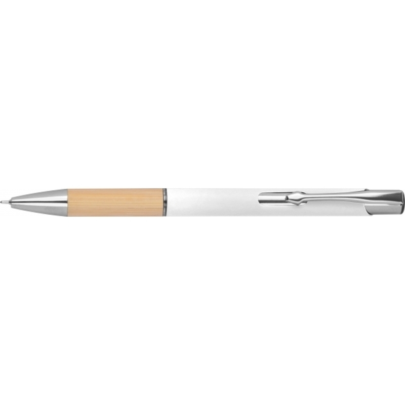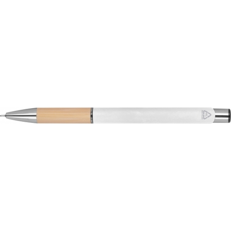 Semi gel pen made from recycled aluminum with a rubber finish surface. It also features a bamboo grip zone, a blue-writing plastic refill (0.5mm tip), and silver accents.