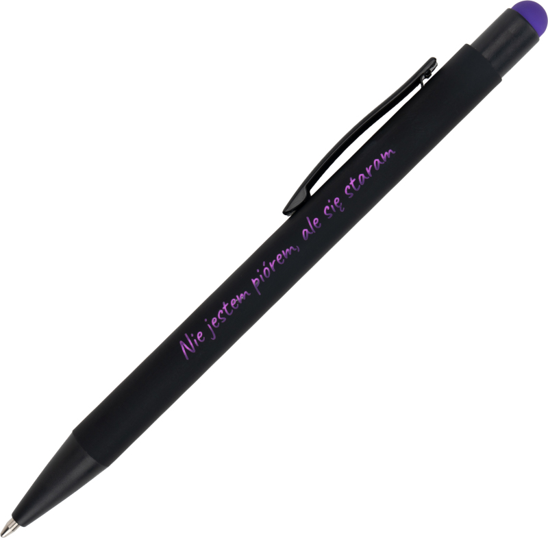 Black metal ballpoint pen with a grippy rubber finish, blue-writing refill, and touch function at the tip. The black body is complemented by a colored touch coating available in various options—ideal for engravings and perfect for everyday use!