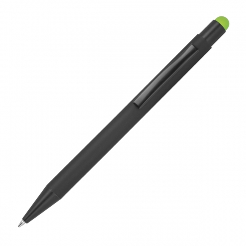 Black metal ballpoint pen with a grippy rubber finish, blue-writing refill, and touch function at the tip. The black body is complemented by a colored touch coating available in various options—ideal for engravings and perfect for everyday use!