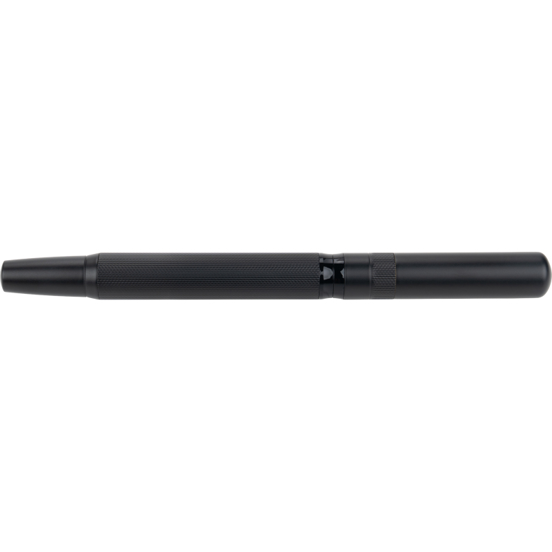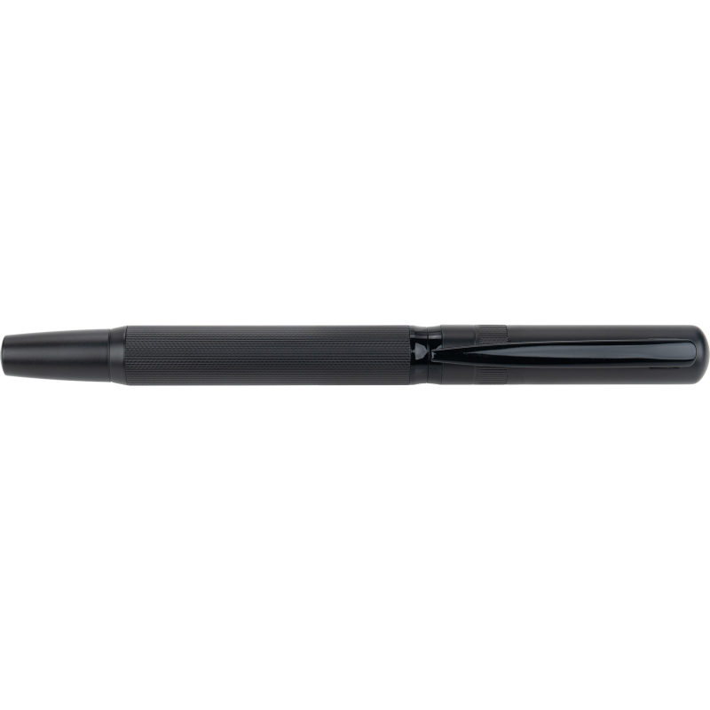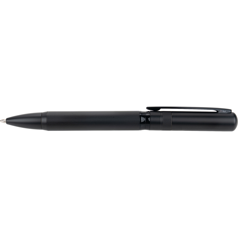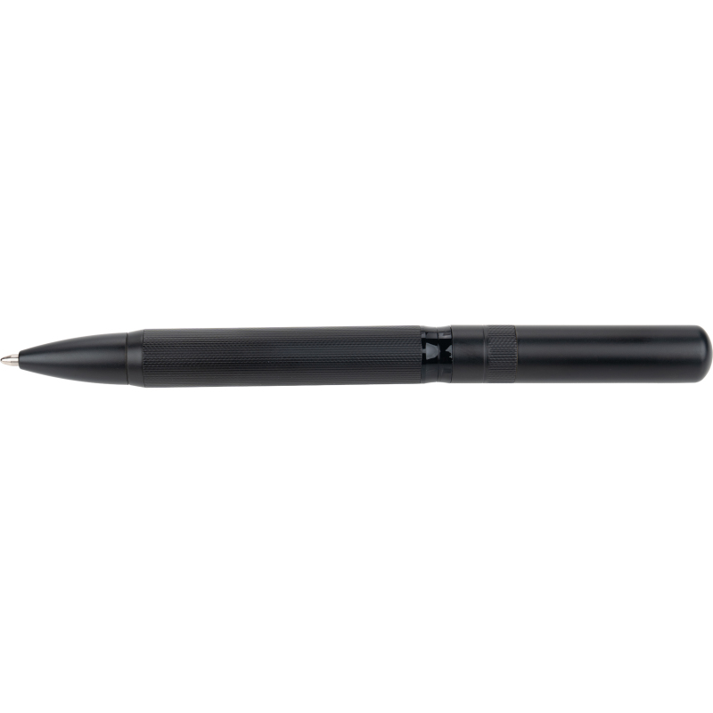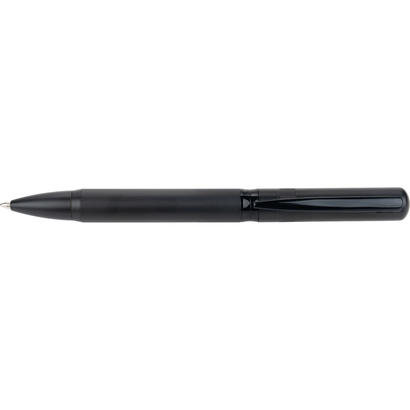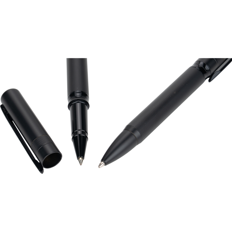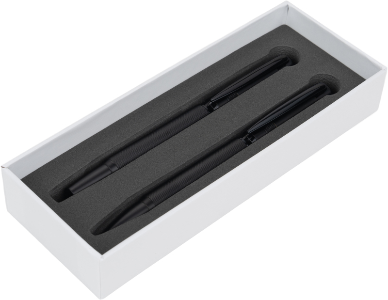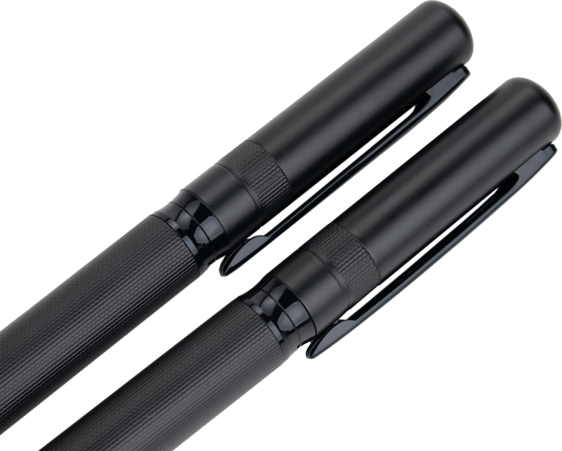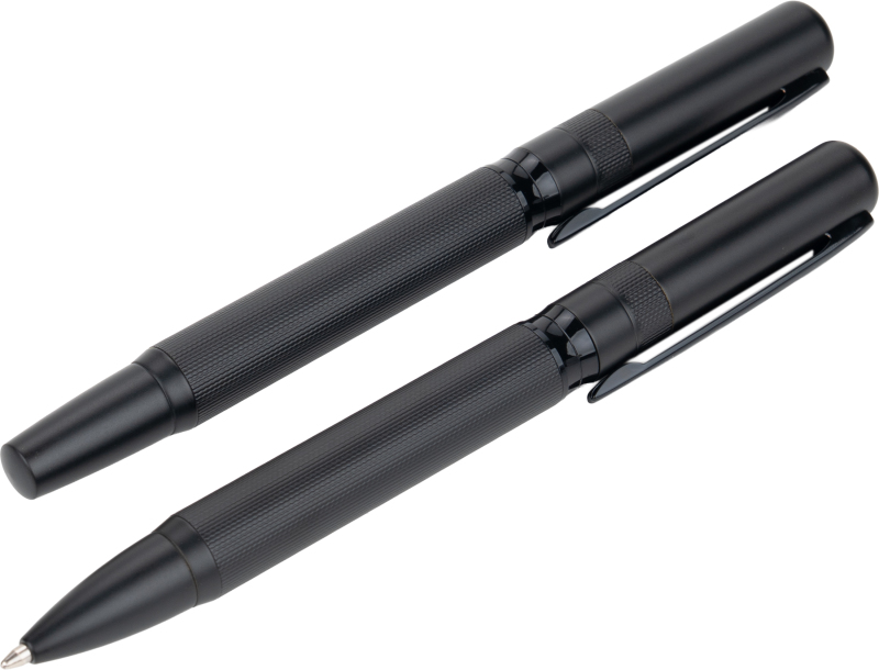 High-quality writing set consisting of a rollerball and a twist ballpoint pen, both with a blue-writing refill in an elegant design. Enhanced with the MoLu logo, matte black printed on the black ring. Perfect for stylish writing and an exclusive gift!