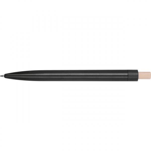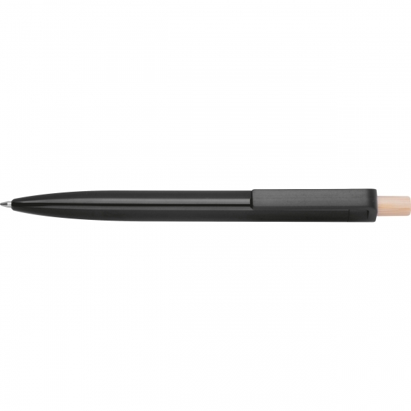 Ballpoint pen made from recycled ABS with a bamboo push button. It features a blue-writing plastic refill. Your logo is printed on the barrel below the clip.