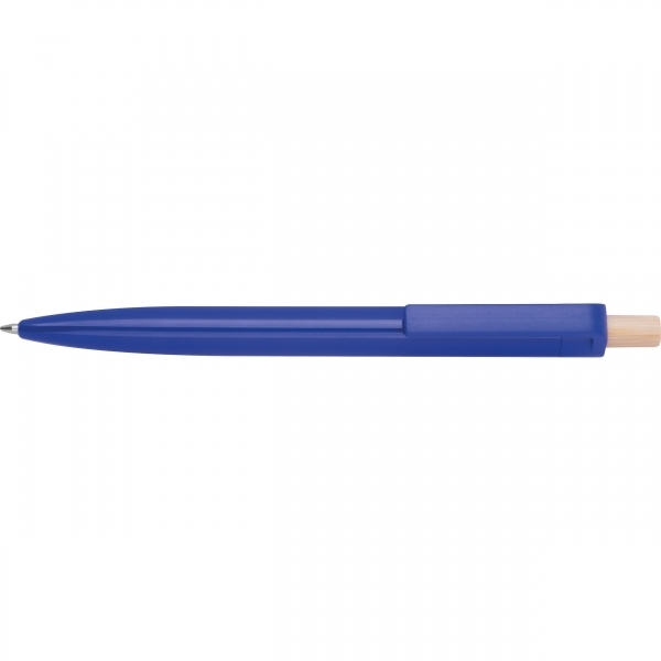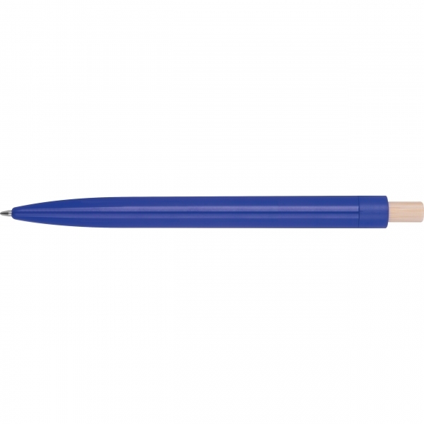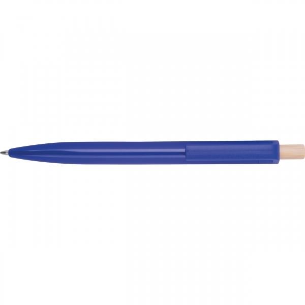 Ballpoint pen made from recycled ABS with a bamboo push button. It features a blue-writing plastic refill. Your logo is printed on the barrel below the clip.