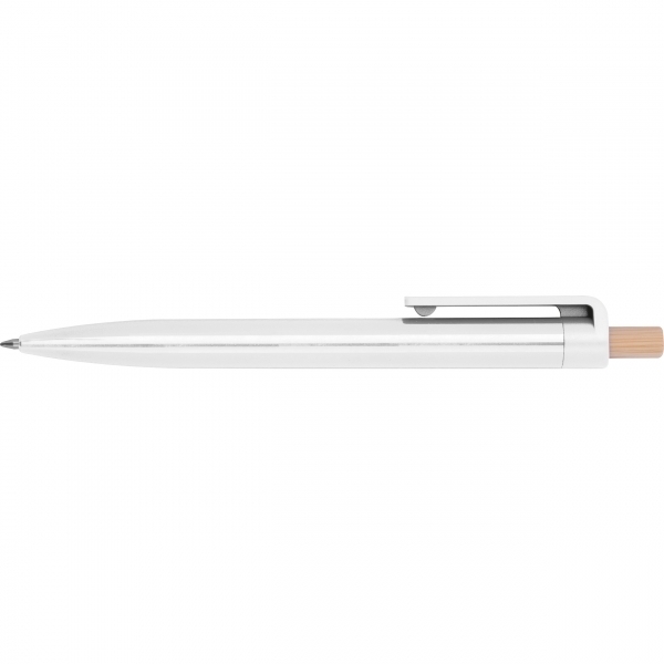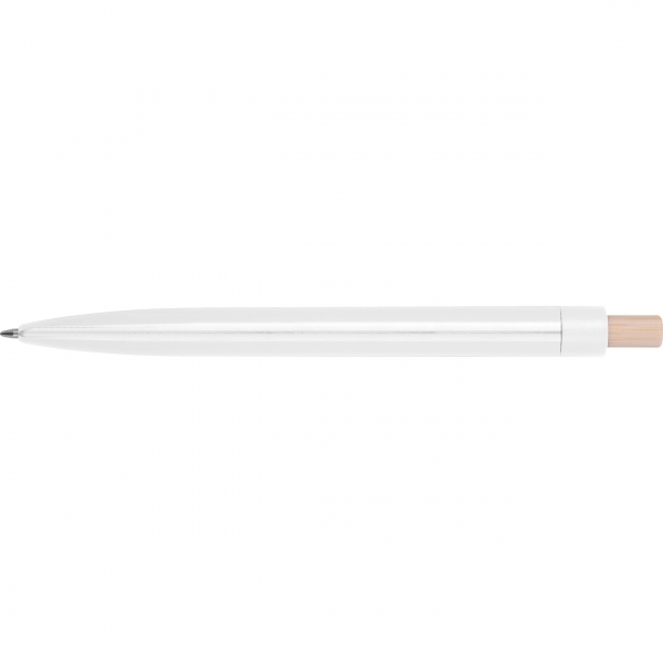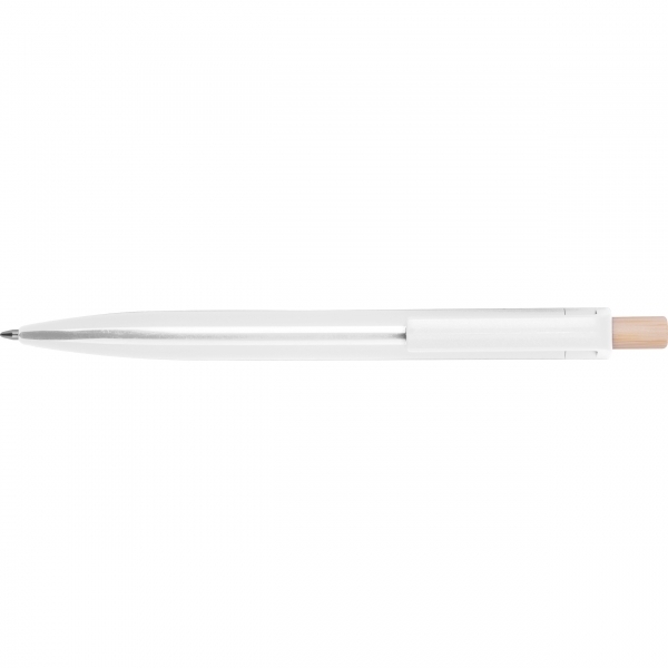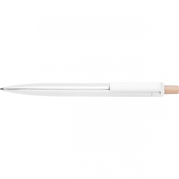 Ballpoint pen made from recycled ABS with a bamboo push button. It features a blue-writing plastic refill. Your logo is printed on the barrel below the clip.