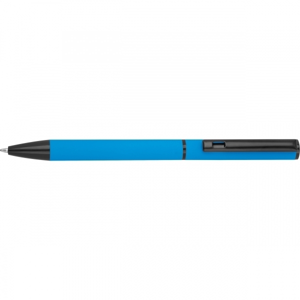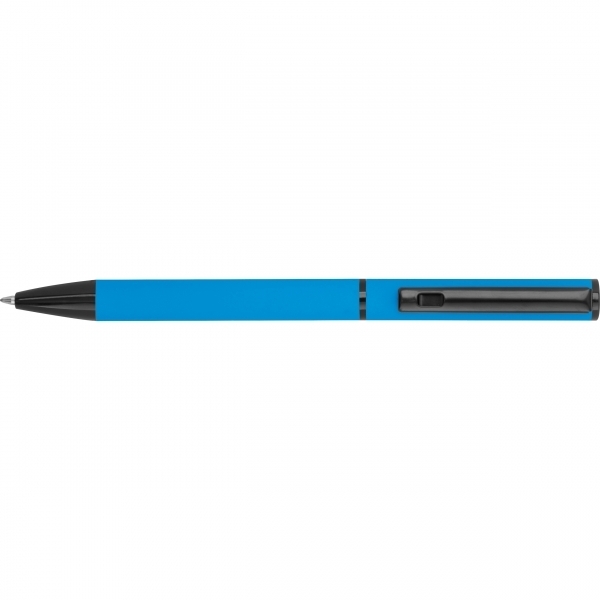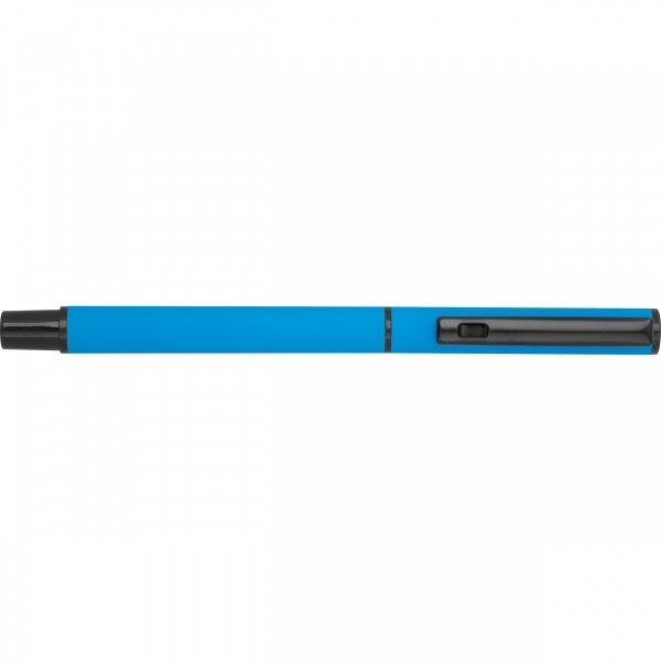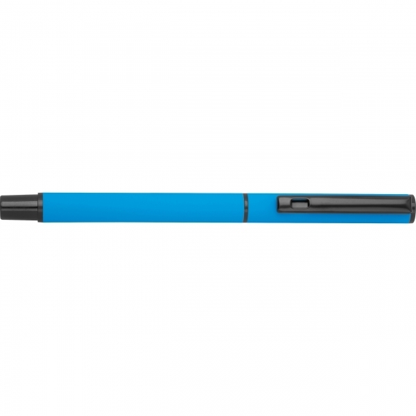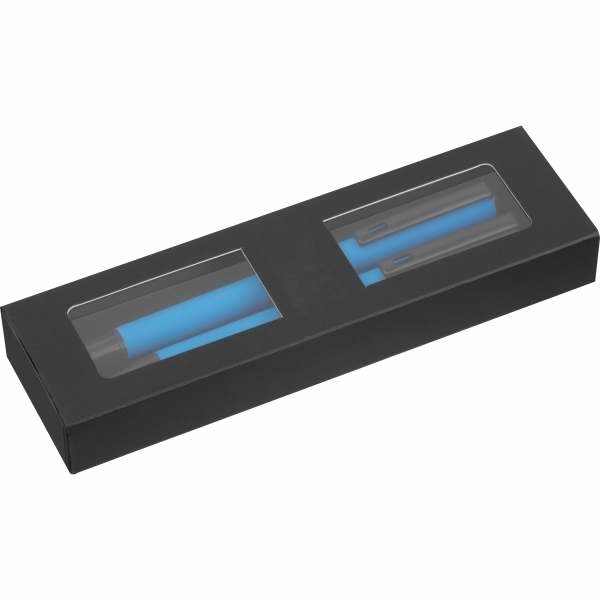 Writing set consisting of a black-ink rollerball pen and a blue-ink twist ballpoint pen (with large-capacity plastic refill), packaged in a box. Your logo is applied to both pens using laser engraving, in the same size.