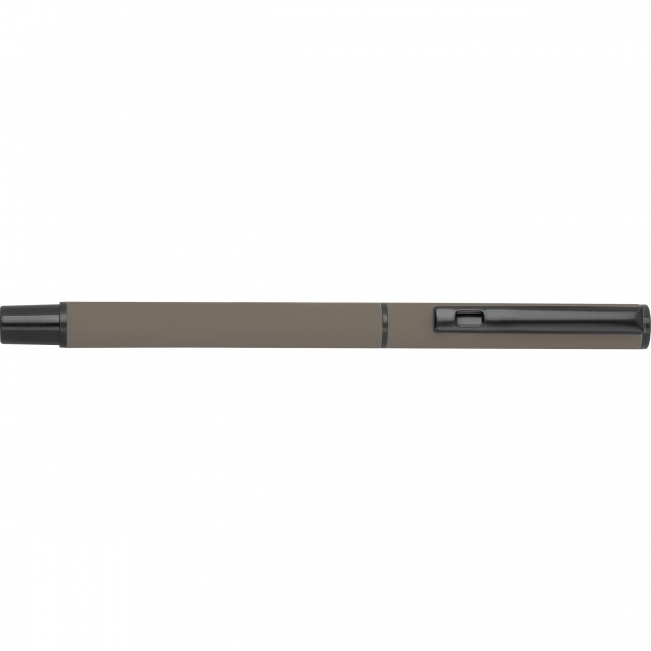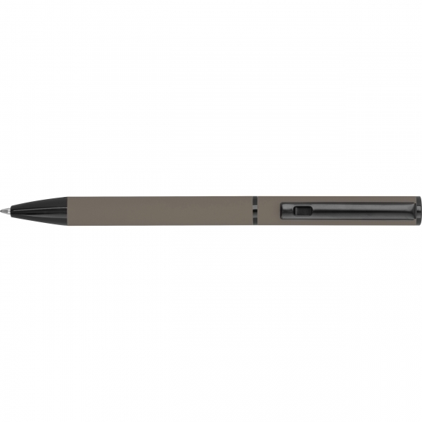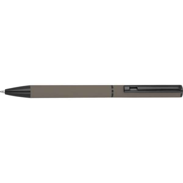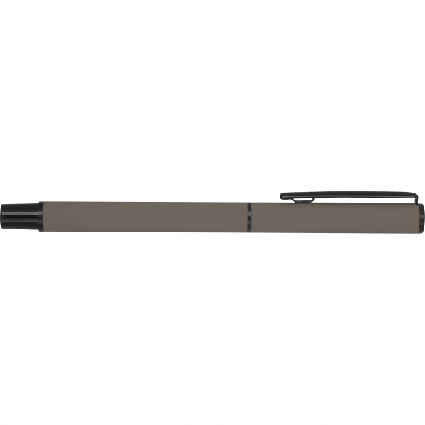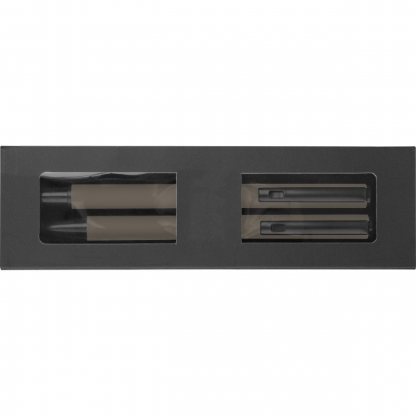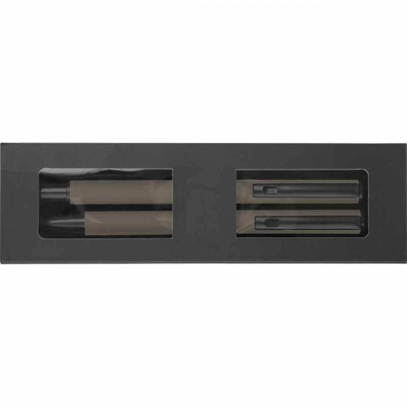 Writing set consisting of a black-ink rollerball pen and a blue-ink twist ballpoint pen (with large-capacity plastic refill), packaged in a box. Your logo is applied to both pens using laser engraving, in the same size.