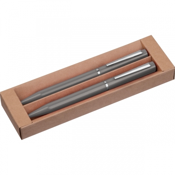 Writing set consisting of a blue-writing twist ballpoint pen, an inkless twist pen, and a cardboard box. Both pens are made from recycled ABS. Your logo is printed on both writing instruments.