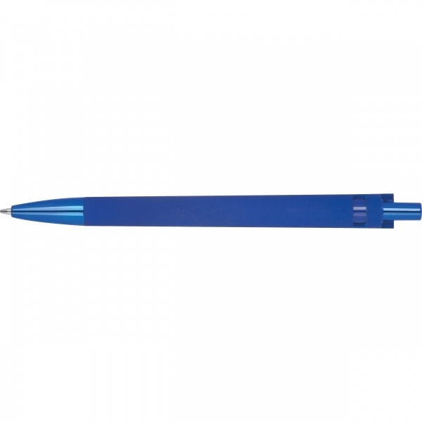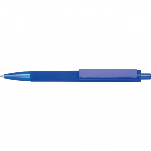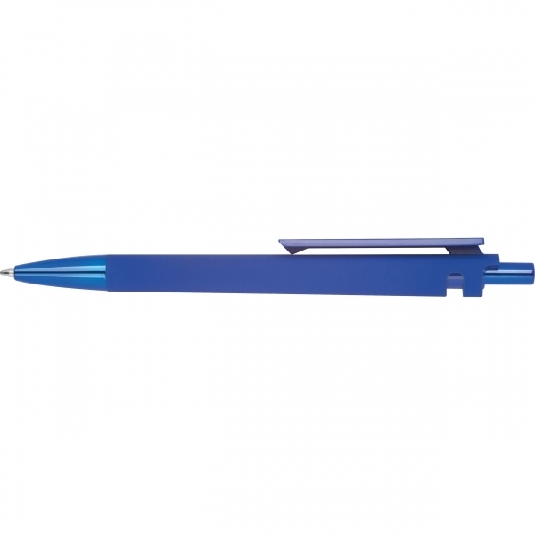 This high-quality blue-writing ballpoint pen, made from recycled ABS, impresses with its durable construction. The rubberized surface ensures a comfortable grip, while the tip and push button are refined with an elegant UV plating.