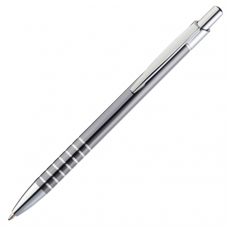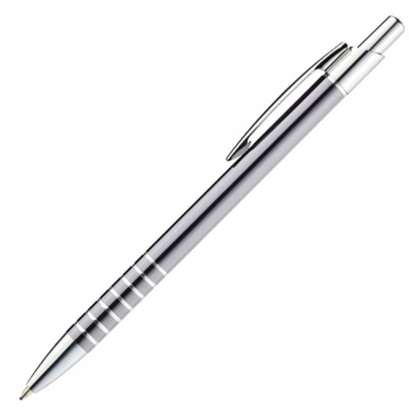 Slim metal ballpen with blue-writing refill and engraved grip zone. We engrave your logo below the clip.