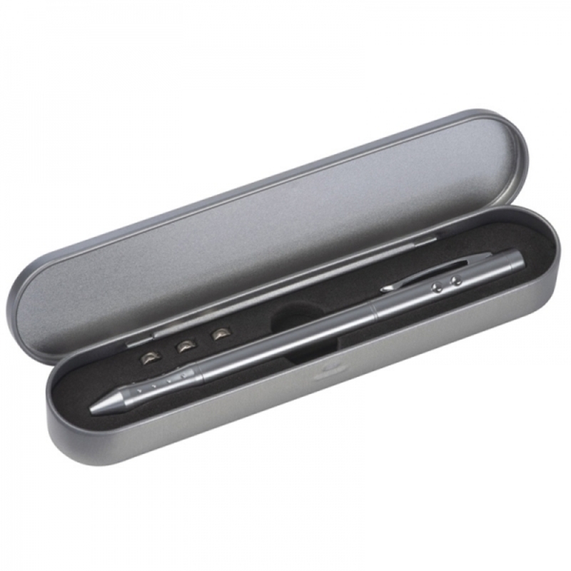 Laser pointer. Metal pen with red and blue writing refills, laser pointer, and LED; includes three button cell batteries and a metal box. Your logo will be engraved.